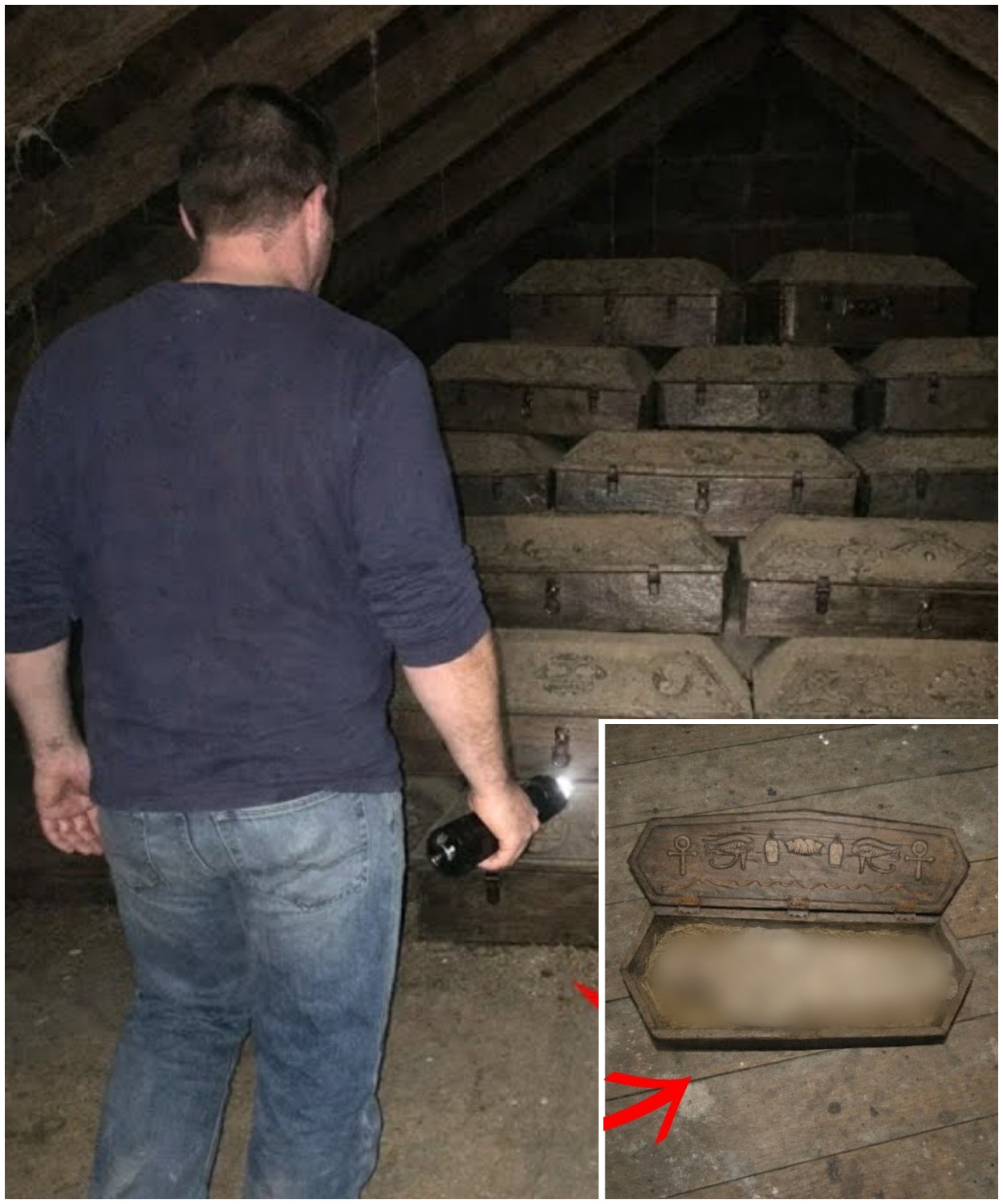 A man renovating his inherited farmhouse broke through a hidden wall to discover a secret attic piled high with child-sized coffins.