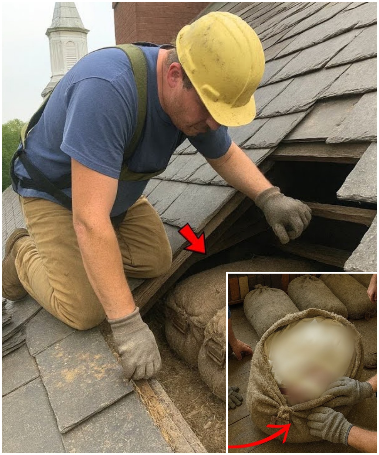 Roofers repairing a century old church discovered a secret crawl space hiding five heavy burlap sacks.