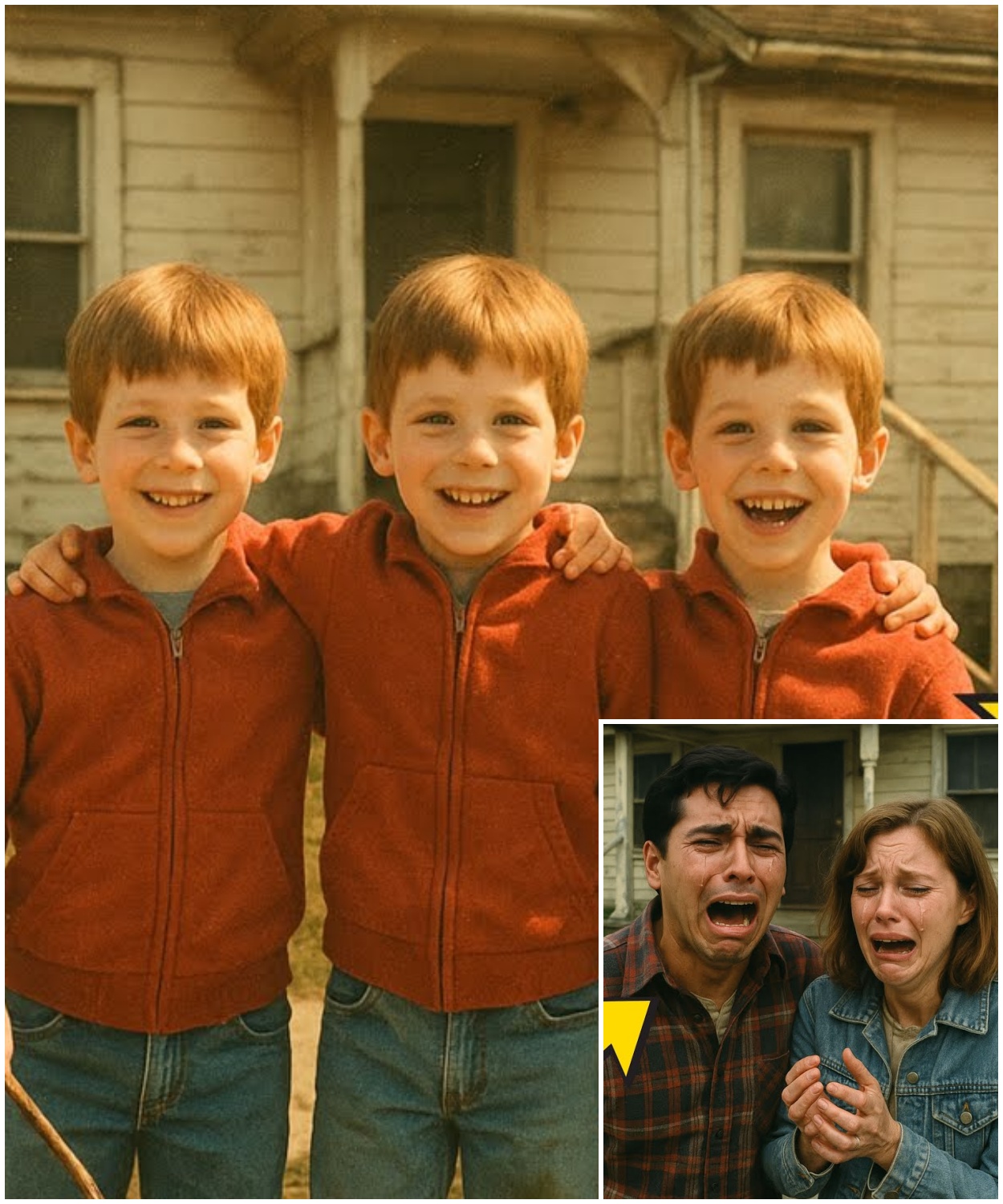“Oh my god!” Three boys, identical in appearance, smiled at the camera in matching red jackets.
